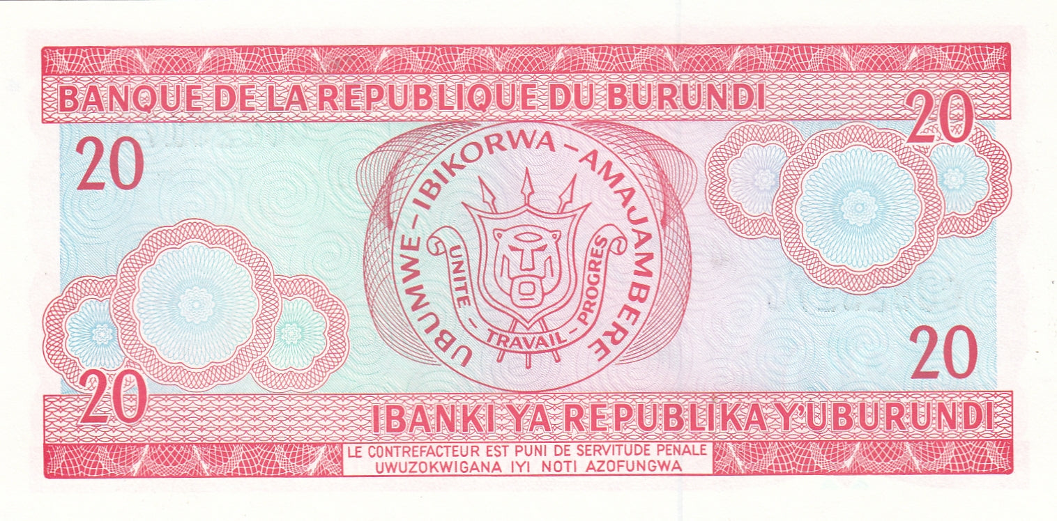 S19-BAN-0036 Burundi 20 Francs 35462 P27d UNC Sinamenye Nteziryayo