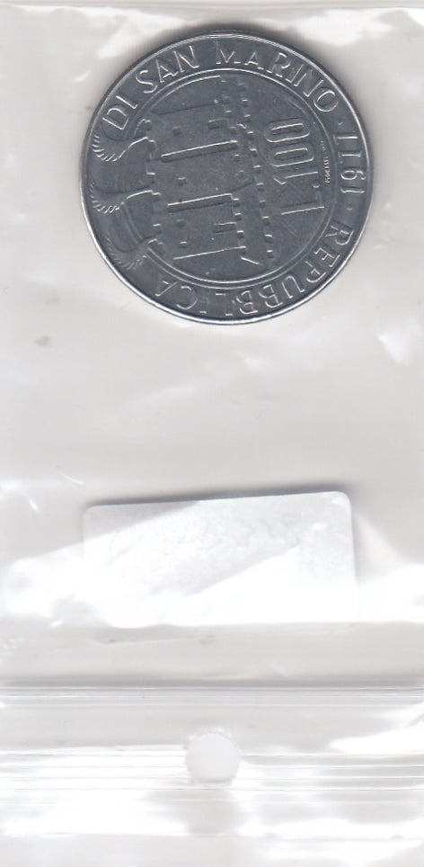 S22-VAT-0338 San Marino 100 lire UNC 1977 KM69 Earth woonded